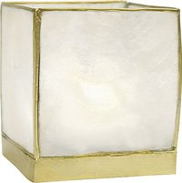 2.5 inches x 2.5 inches x 3 inches high. Made of natural sea shell from the windowpane oyster, these light and delicate candle holders are hand-crafted in the Philippines. Each piece of shell is hand-cut and wrapped in gold foil for an especially exotic look. Beautifully translucent and opalescent, they provide a soft and shimmery candlelight glow. We recommend the use with tealight candles with these holders.