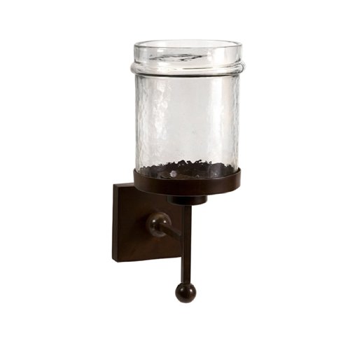 Display your pillar candle in this contemporary wall sconce with clear glass candle holder and iron wall bracket